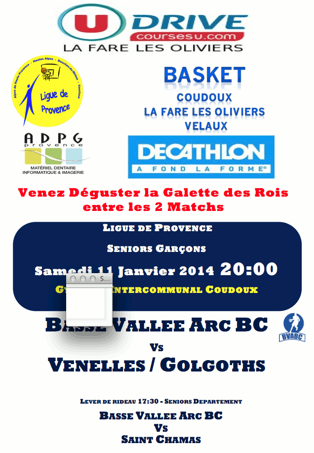 Galette des Rois: Samedi 11 Janvier Publié le 6 janvier 2014 par calamar Venez nombreux deguster la galette des rois entre les 2 matchs seniors garçons Samedi 11 Janvier vers 19:00 à la salle intercommunale Patrice Centaro à Coudoux