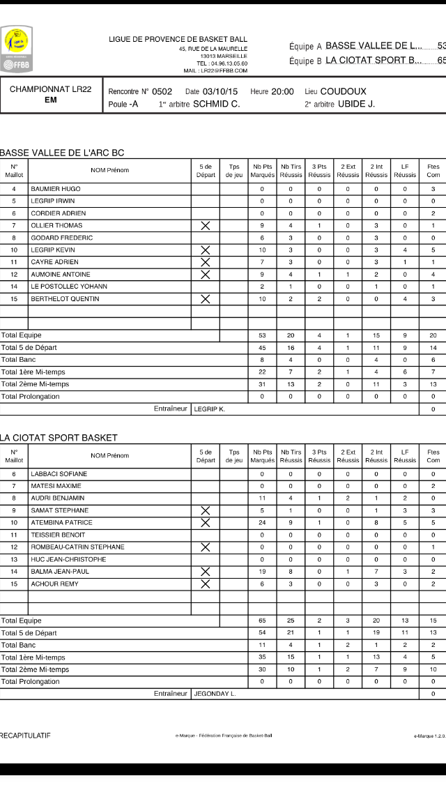 Le deuxième QT nous avons sensiblement été sur les mêmes bases sauf que cavaillon marquait beaucoup en deuxième chance suite à des rebonds offensifs ou à des joueurs opportunistes à l opposé. Chez nous c est Thomas qui tenait le score avec 10pts ce QT.